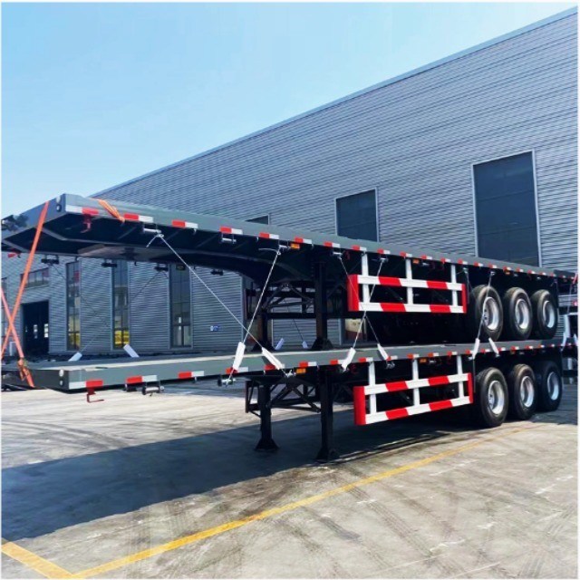 ¿Qué quieres decir?Los semirremolques de lecho plano se utilizan generalmente para transportar contenedores de 20FT / 40FT / 45FT. Cuanto más bajo sea el centro de gravedad, mejor será la estabilidad y la seguridad.Cuanto mejor sea la capacidad de transportar cargas muy altas y pasar obstáculos aéreosDe acuerdo con el número de ejes y el tamaño de los neumáticos, la carga del semirremolque de cama plana también es diferente.y el rango de carga está entre 40-120 toneladas.